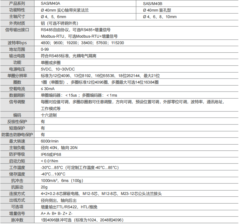 RS485、MODBUS-RTU絕對值工業編碼器SAS/M40保證產品每個元器件的百分之百純國產化高精確的磁式感應技術,單圈或多圈編碼器RS485自由通訊接口或Modbus-RTU接口可額外增加增量信號TTL或HTL輸出單圈分辨率最高可達21位,多圈圈數高達14位超強的抗沖擊和抗振動能力具備反短接和短路保護、有效降低安裝錯誤對編碼器造成影響