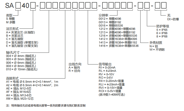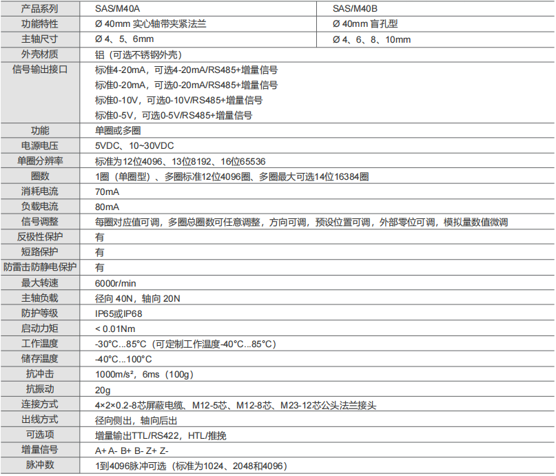 4-20MA、0-20MA、0-10V、0-5V絕對值工業編碼器SAS/M40保證產品每個元器件的百分之百純國產化高精確的磁式感應技術,單圈或多圈編碼器模擬量電流4-20mA、0-20mA或電壓0-10V、0-5V輸出可額外增加增量信號TTL或HTL輸出單圈分辨率最高可達16位,多圈圈數高達14位超強的抗沖擊和抗振動能力具備反短接和短路保護、有效降低安裝錯誤對編碼器造成影響