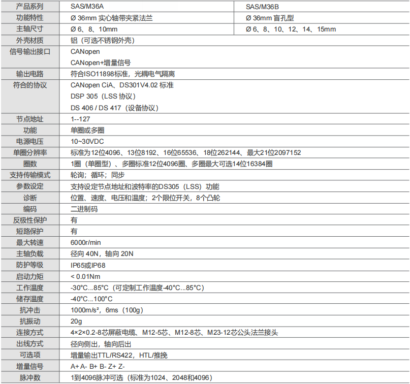 CANopen絕對值工業(yè)編碼器SAS/M36保證產(chǎn)品每個(gè)元器件的百分之百純國產(chǎn)化高精確的磁式感應(yīng)技術(shù),單圈或多圈編碼器CANopen總線,最高1MHz Baud可額外增加增量信號(hào)TTL或HTL輸出單圈分辨率最高可達(dá)21位,多圈圈數(shù)高達(dá)14位超強(qiáng)的抗沖擊和抗振動(dòng)能力、高防護(hù)等級(jí):最高IP68具備反短接和短路保護(hù)、有效降低安裝錯(cuò)誤對編碼器造成影響