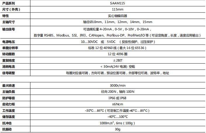 SAAM115系列重載型多圈絕對值編碼器,釆用重載型結構設計, 具備優異的抗振和抵抗機械損傷性能。可承受大負荷的軸向和徑向負載。 SAAM115系列產品機械安裝具備法蘭安裝和底座安裝兩種方式可供選擇,多角度 出線方向可選擇,極大方便客戶根據現場情況安裝。