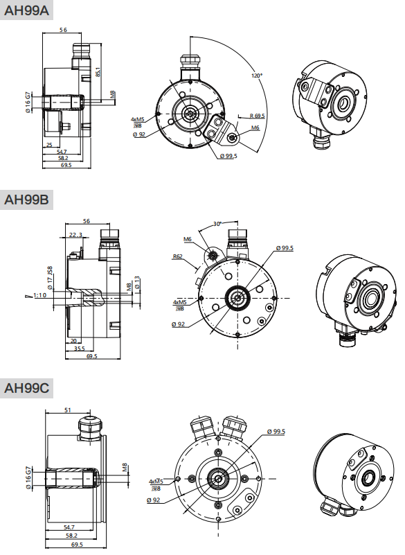 AH99重載型增量編碼器具有防雷擊、過壓、過流、浪涌沖擊保護外殼具有防護等級 IP67的堅固外殼、可防止受到灰塵和液體的污染。用于危險環境的型號通過ATEX認證每圈脈沖數最高可達10000P/R可提供雙重輸出模塊,帶有雙重掃描傳感器和兩個電氣隔離的電子電路該雙重輸出信號可用于兩種不同功能的獨立系統,或者用于獲得冗余信號用軸向螺釘固定的空心軸。軸尺寸:?12 mm、 ?16 mm和?17 mm 錐軸。絕緣PEEK軸襯、用于防止軸承受到軸電流的影響扭矩支架有多種方向的型號可供選擇,用于固定扭臂。獨立后蓋、用于將電纜線連接到螺釘型端子充足的空間、方便于在連接電纜時進行處理操作。 M23 連接器或預裝電纜(帶或不帶連接器)